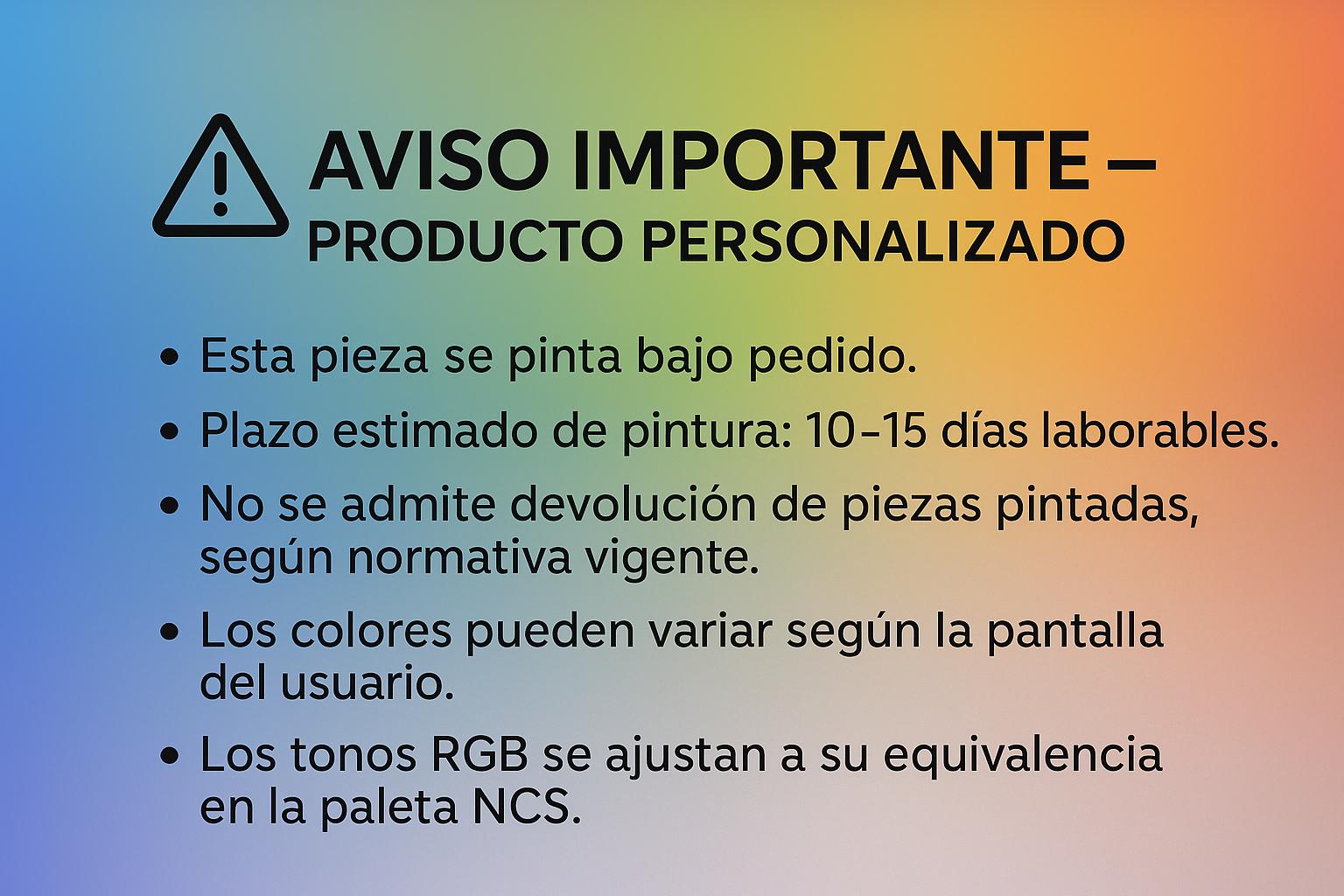 - Las piezas pintadas no admiten devolución, salvo defecto demostrable de fabricación o error por nuestra parte.