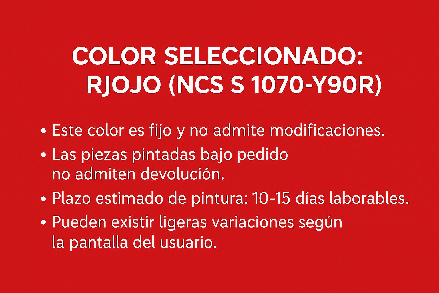 - Las piezas pintadas no admiten devolución, salvo defecto demostrable de fabricación o error por nuestra parte.