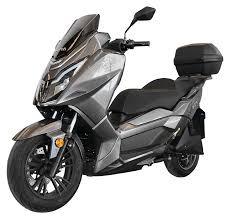 Ebroh Strada 9K en color gris es una maxiscooter eléctrica diseñada para ofrecer un rendimiento similar a una moto de 125 cc.Destaca por su autonomía de hasta 150 km y una velocidad punta de 120 km/h. Es una opción popular para movilidad urbana y trayectos interurbanos gracias a su motor potente y su diseño